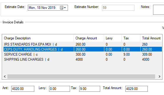 Freight Office lets you to enter billable items and generate a Pro-forma for all your consignees. A quote is a simple item and cost, all the taxes are calculated with the set Tax Table. Estimates can be converted to Invoices.